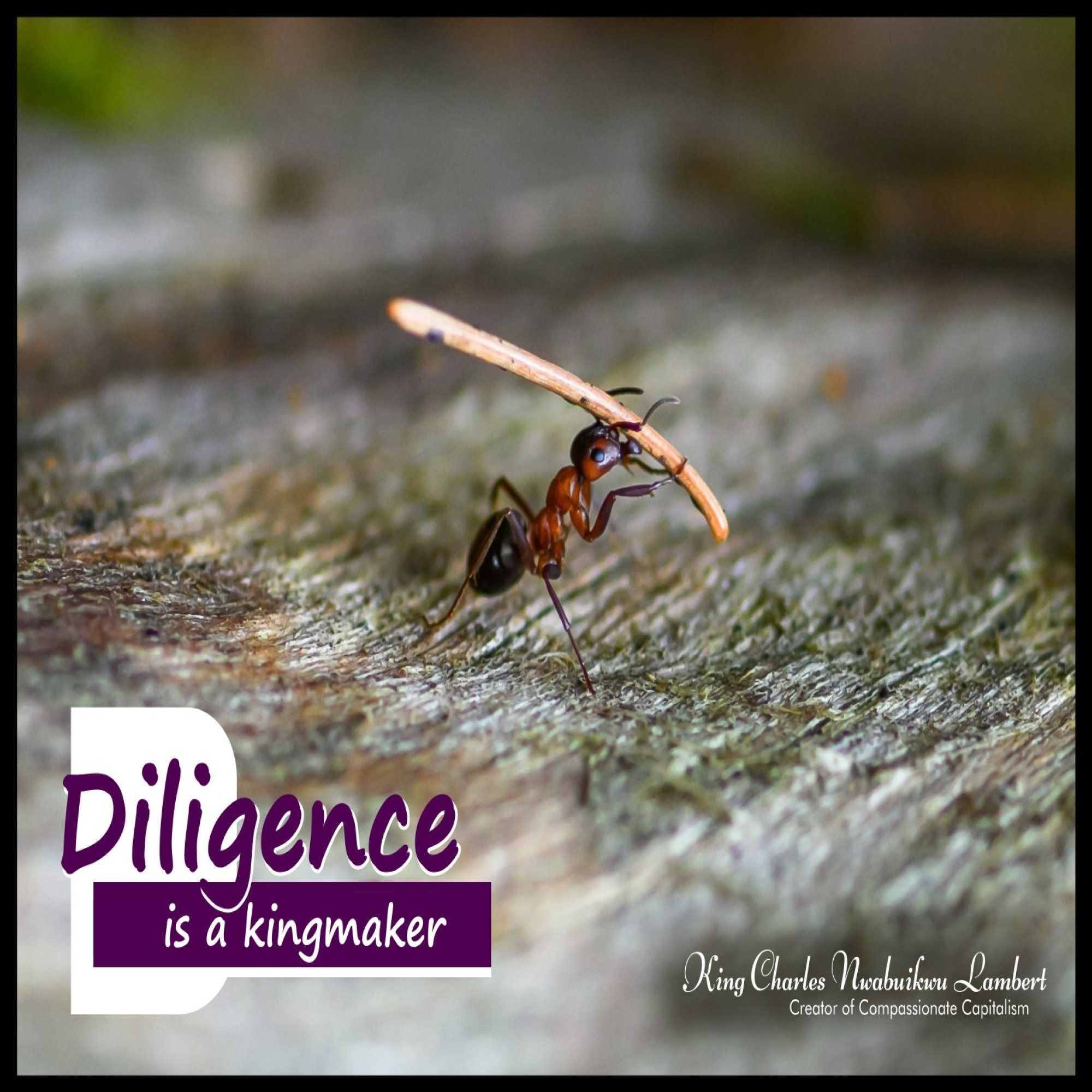 portrait, featuring the empowering quote, "Diligence is a kingmaker,"
