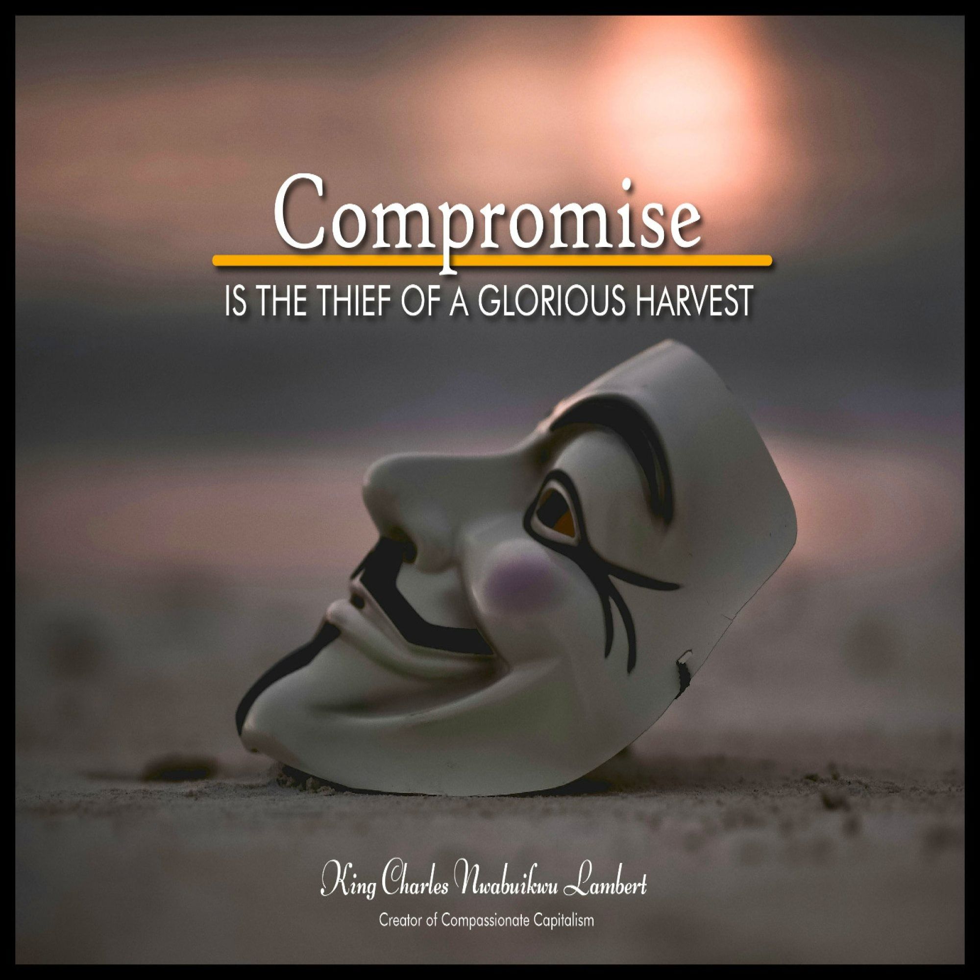 Elevate your space with "NO COMPROMISE", an inspiring wall portrait that champions unwavering commitment and excellence. Featuring the quote, "Compromise is the thief of a glorious harvest," by King Charles Nwabuikwu Lambert, this piece serves as a powerful reminder that true success comes from dedication and perseverance.