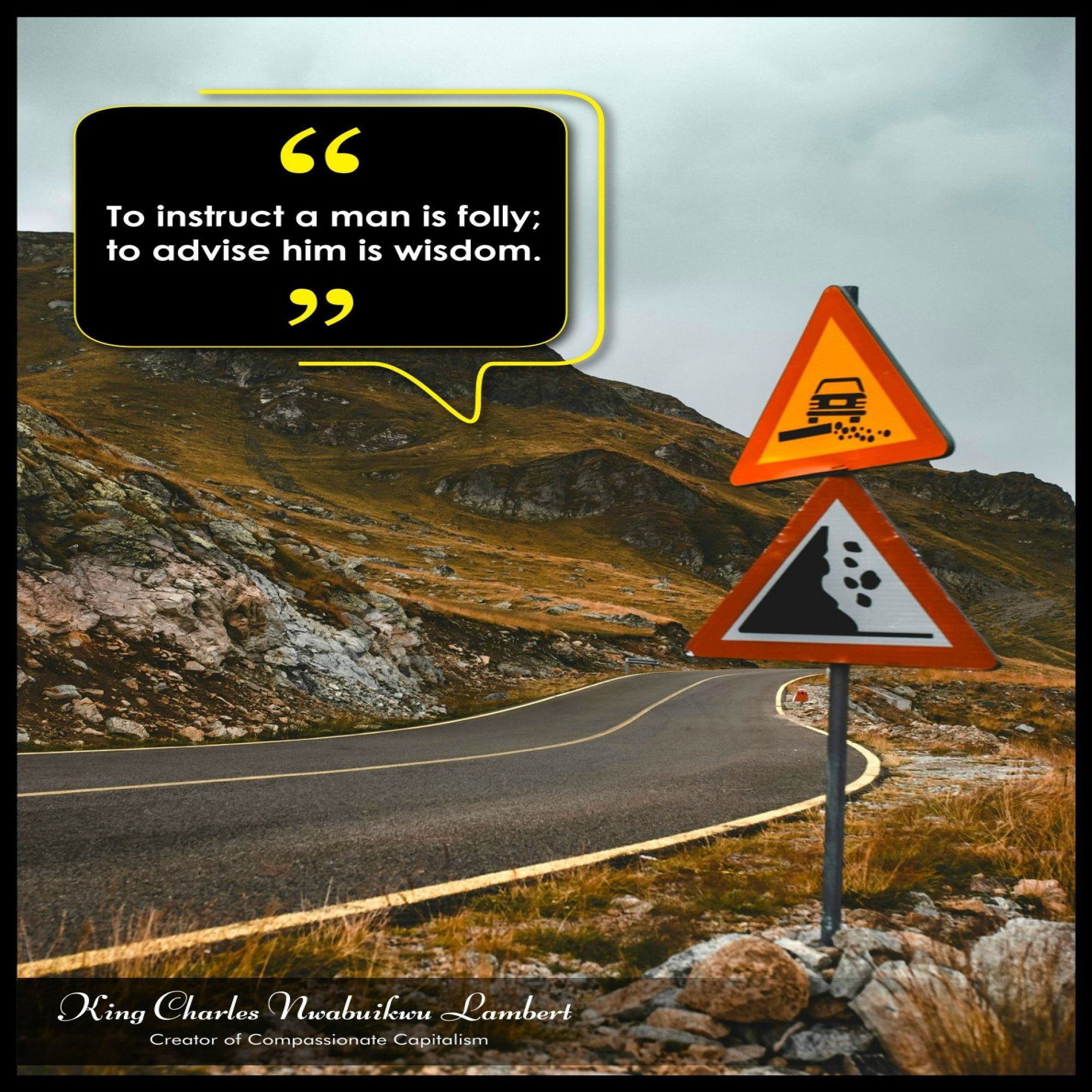Inspire wisdom with "The Art of Guidance", a profound wall portrait that emphasizes the power of influence over instruction. Featuring the insightful quote, "To instruct a man is folly; to advise him is wisdom," by King Charles Nwabuikwu Lambert, this piece serves as a reminder that true leadership lies in offering guidance, not control.